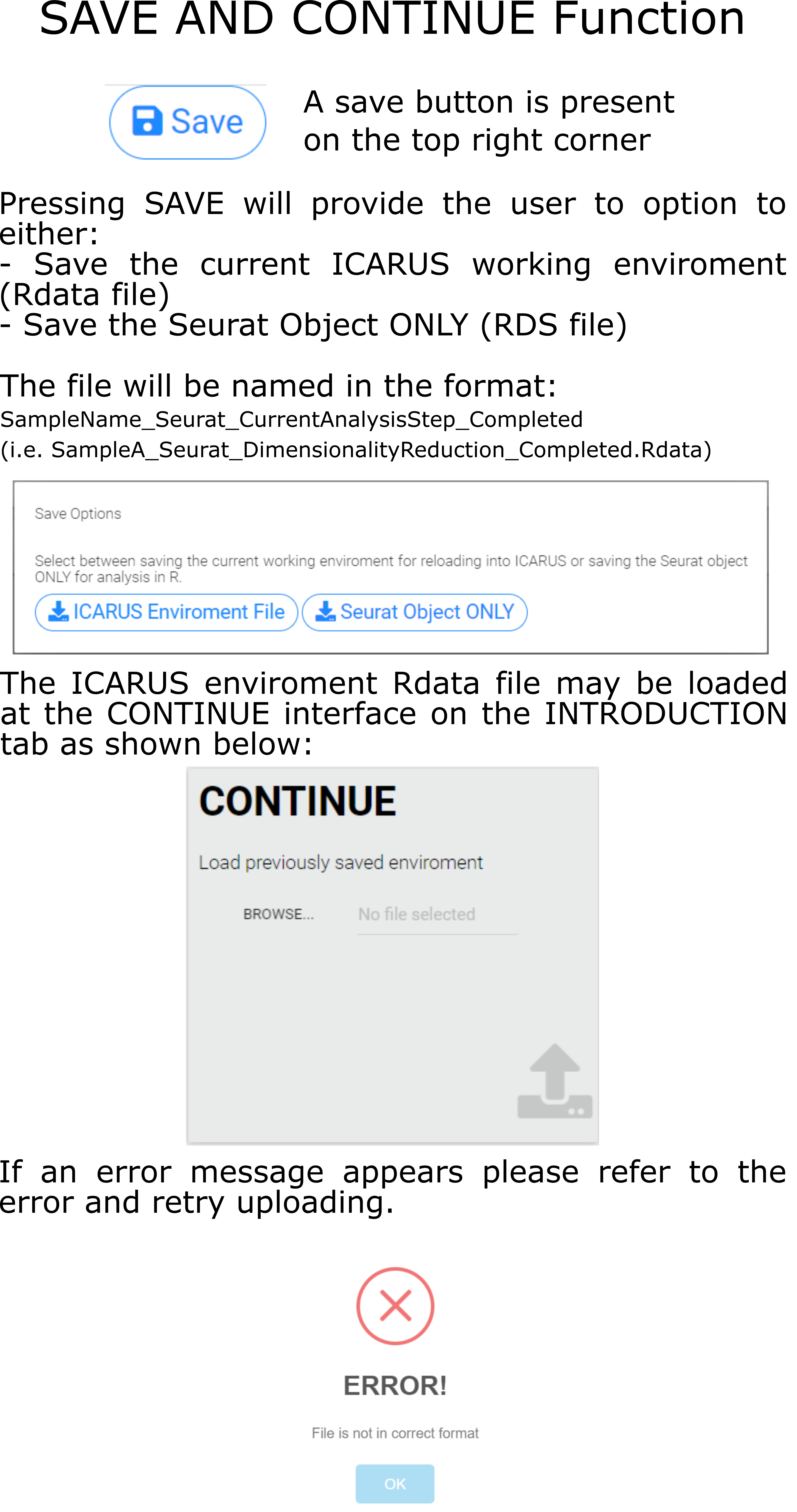 A table of gene counts (matrix of UMI counts for each gene per cell) is required for ICARUS. Datasets with single or multiple samples/replicates may be loaded.
